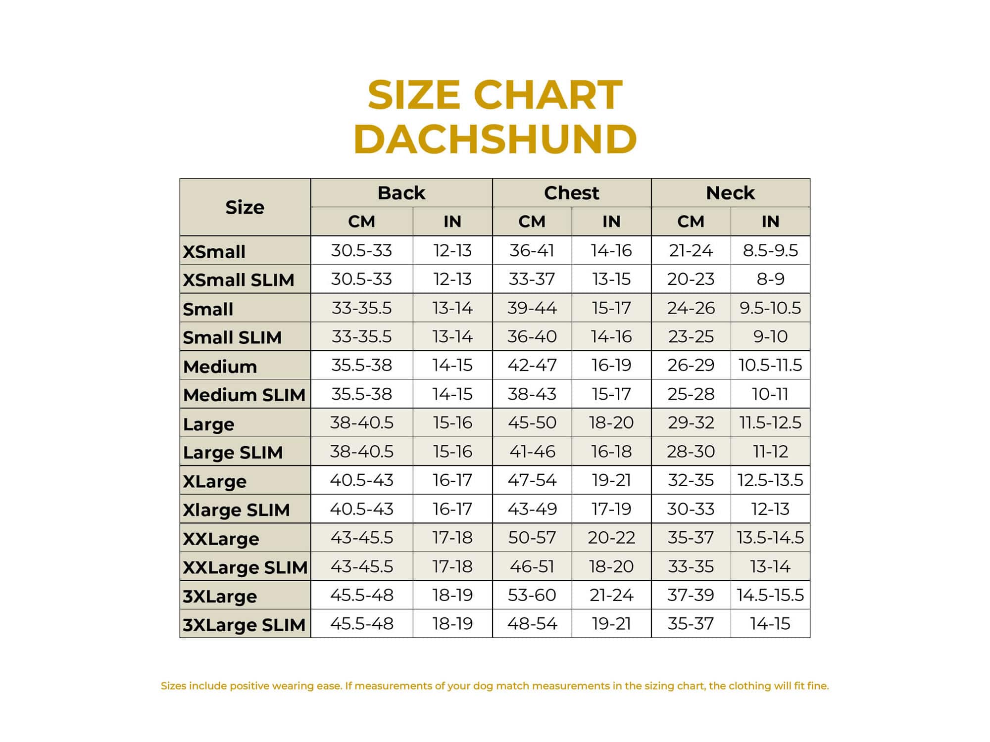 Sizes are specific to dogs with similar constitutions as the dog in the pictures (Dachshund).